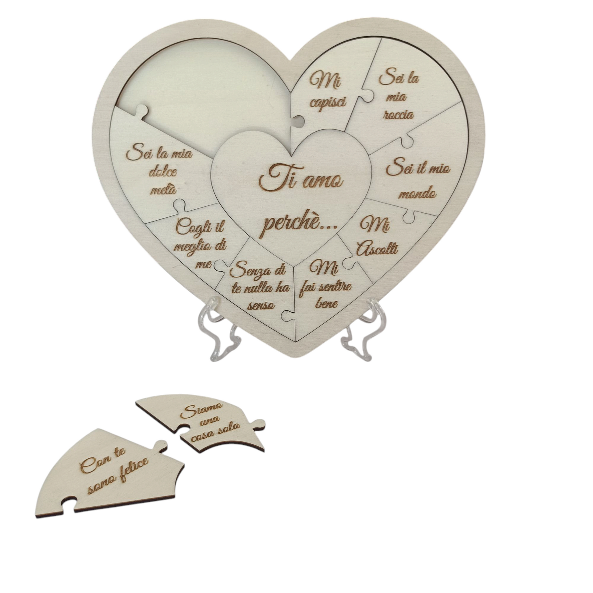 Puzzle di legno a forma di cuore, con ogni pezzo personalizzabile. 11 pezzi totali